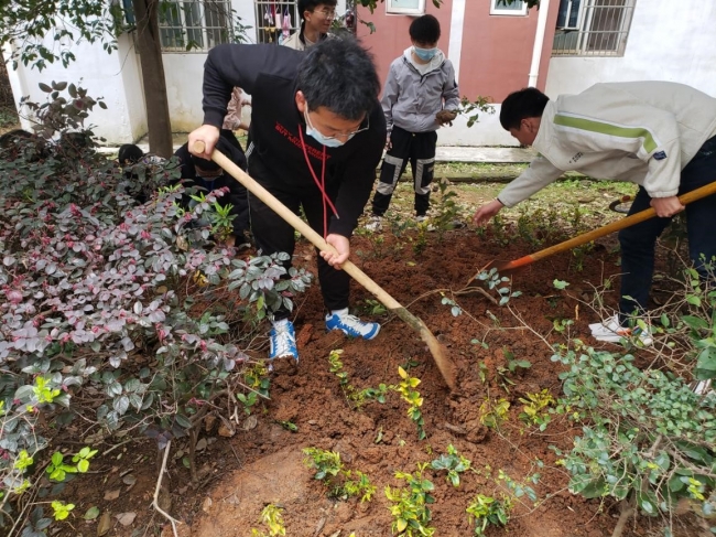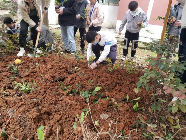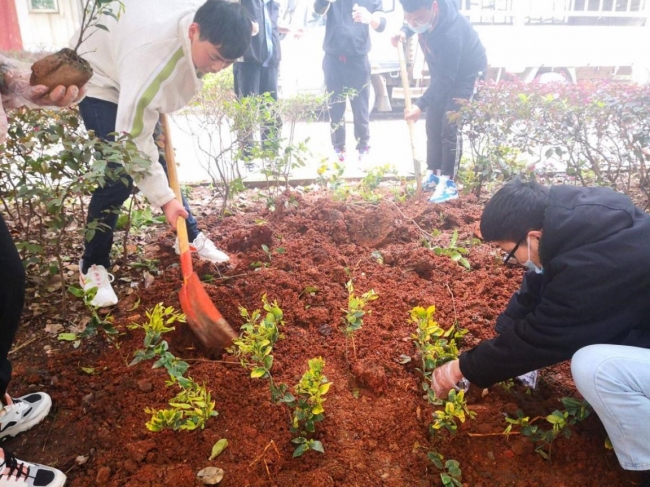 在植树过程中,同学们有序分工、团结协作,认真完成铲土挖坑、扶植树苗、夯实新土等一道道步骤,将树苗栽植在泥土中。与此同时,为了保证树苗的成活率吕书记给同学们科普了植树知识,要深挖坑、距离保持好、多培土,同学们干劲十足,将一棵棵充满生机和希望的小树苗植入校园的土地里,并认真地浇上了一桶桶春天的甘露。
