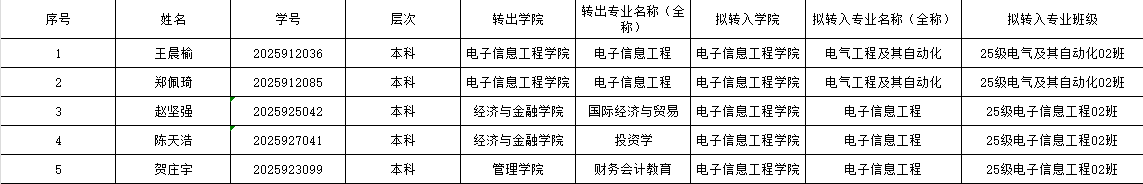 根据汉口学院《关于做好2025-2026学年第一学期2025级新生转专业的通知》,经学生报名、资格审核、面试等程序,由5位评委现场评议,报学院党政联席会议审议,拟同意王晨榆等5名学生转入电子信息工程学院,现将此次拟同意转入学生名单予以公示,公示期为3天。